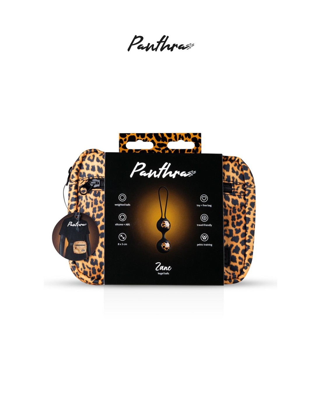 Zane est une paire de boules de Geisha haute qualité, en silicone, couleur panthère, accompagnée de son sac de transport assorti.