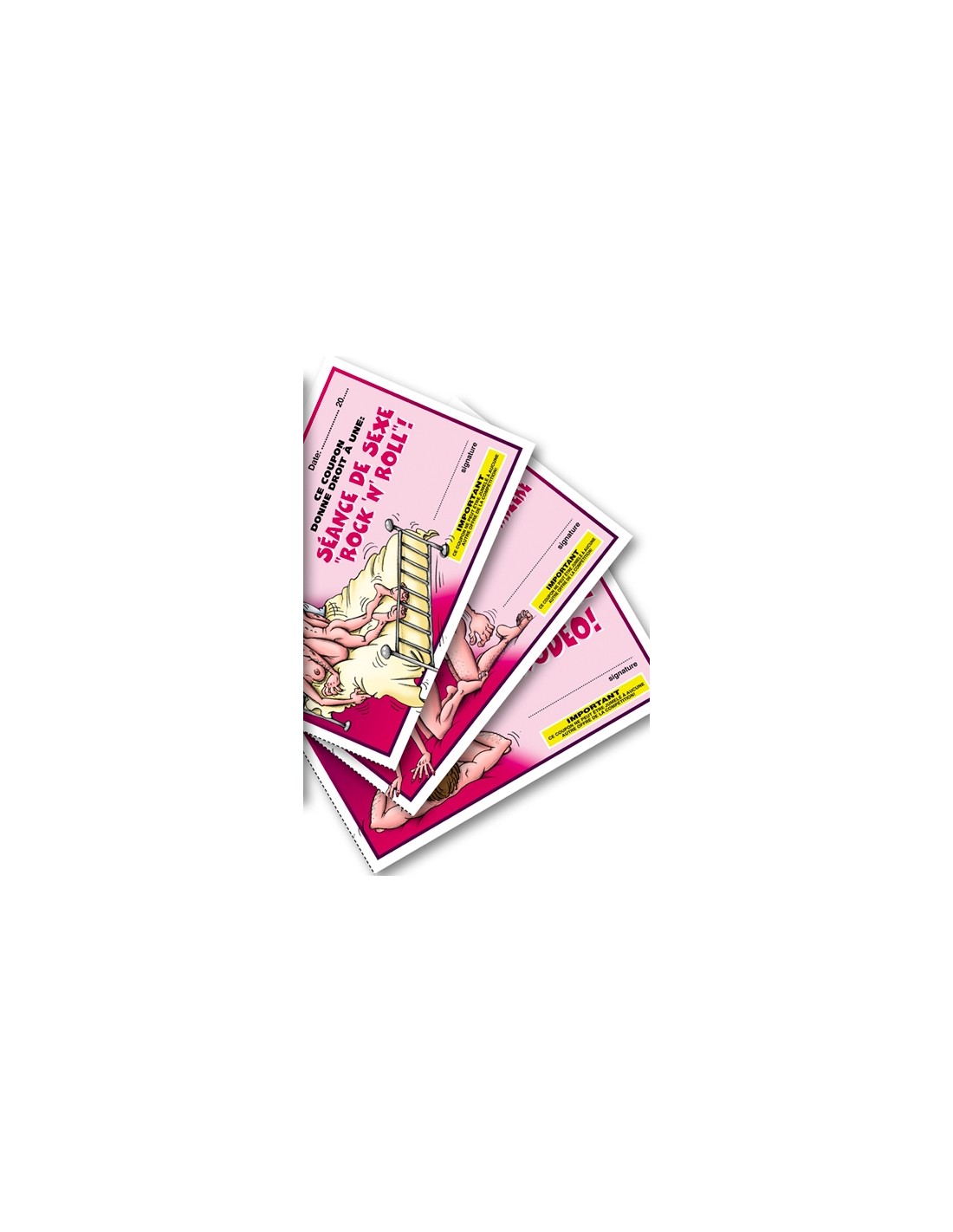 Ces coupons très explicites sont à distribuer à votre (vos) partenaire (s) au gré de vos envies. Voilà un mode humoristique et original pour alimenter vos fantasmes, pour enrichir votre expèrience sexuelle, mais surtout pour se faire plaisir à deux sans se prendre trop au sèrieux!