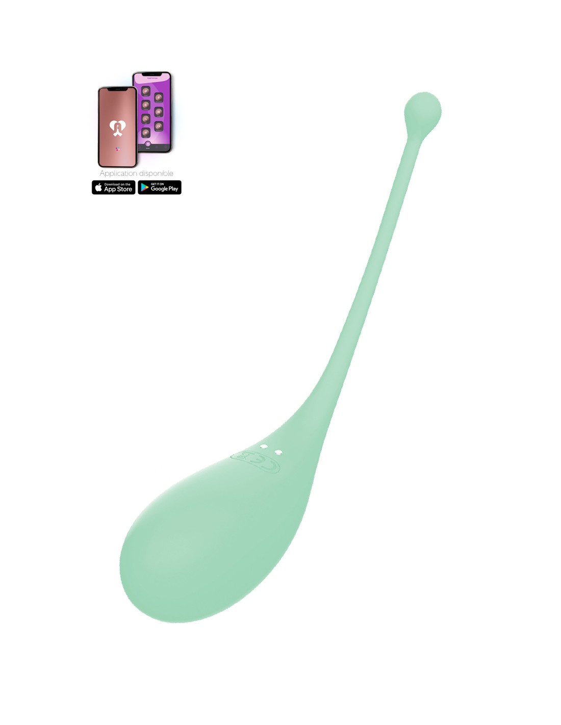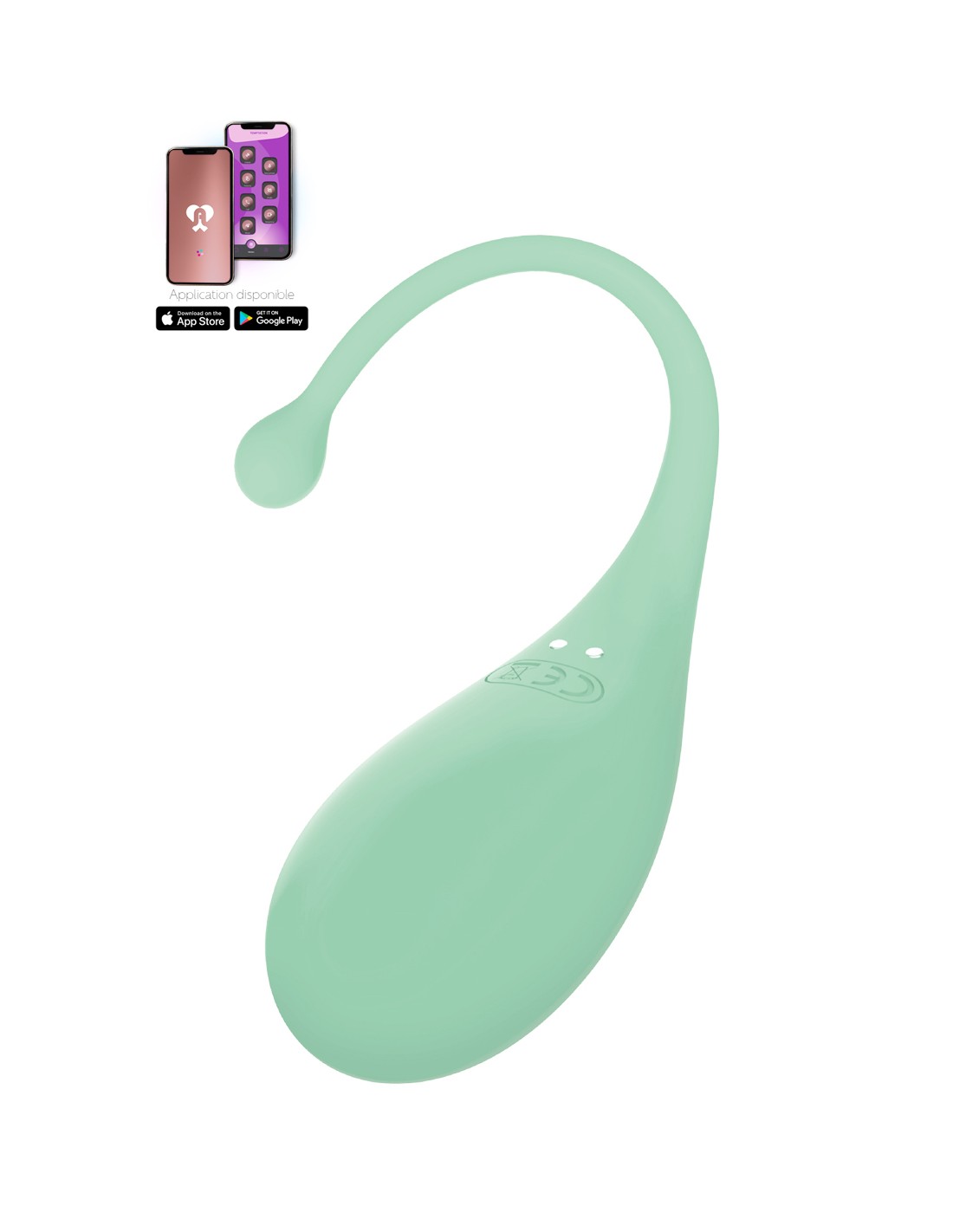Oeuf vibrant vert rechargeable en silicone contrôlé par smartphone sur courte ou longue distance.