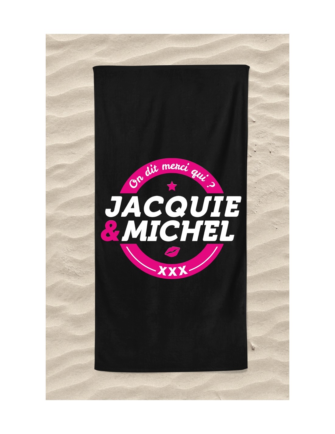 Serviette de plage 75 x 150 cm "on dit merci qui ? Merci Jacquie et Michel", logo rond classique.