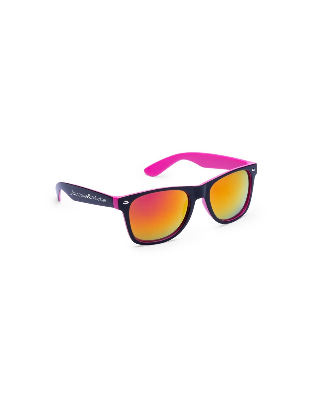 Lunettes de soleil fuchsia et noir avec logo Jacquie et Michel sur chaque monture.