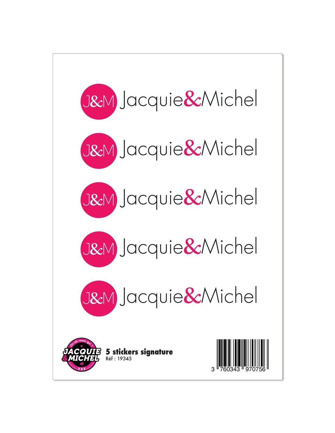 Assumez votre sexualité et affichez votre passion grâce à cette planche de 5 autocollants Signature "Jacquie & Michel" (dimensions 10,6 x 5 cm) à coller où bon vous semble.