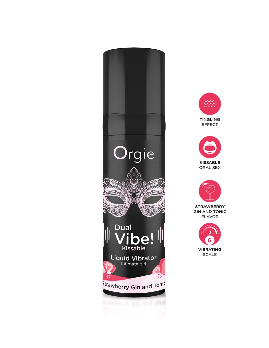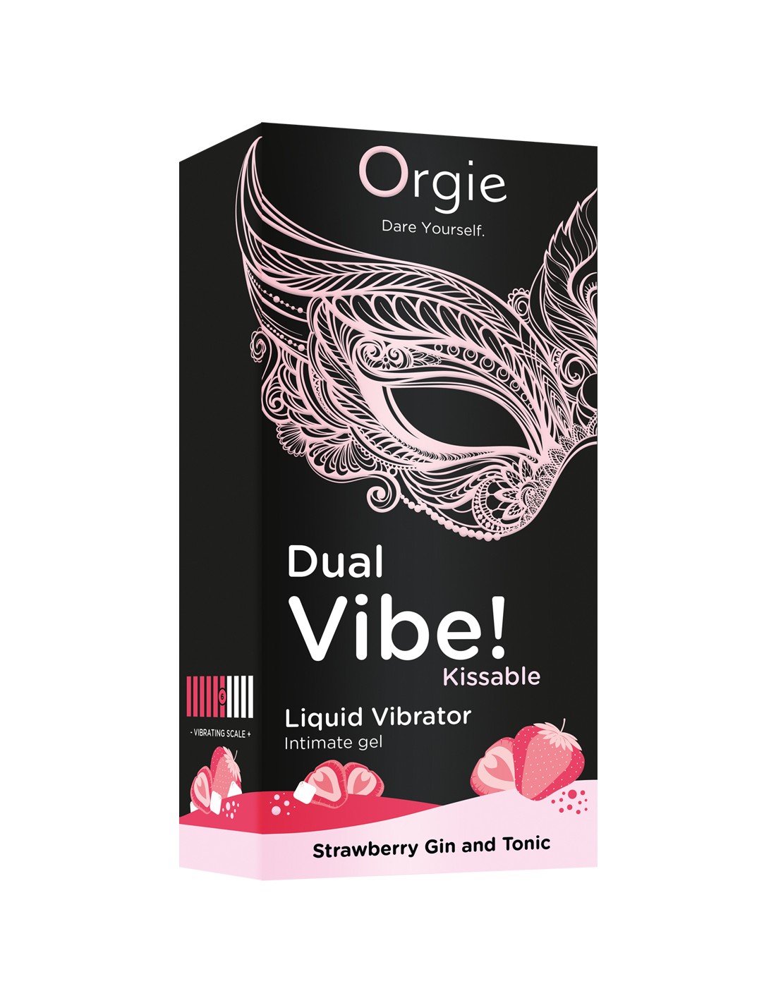 "Dual Vibe! Kissable Liquid Vibrator" est le gel intime d'excitation embrassable de la marque de cosmétique érotique Orgie. Il procure des sensations excitantes (vibrations + picotements) sur les zones intimes tout en étant parfaitement adapté au sexe oral.