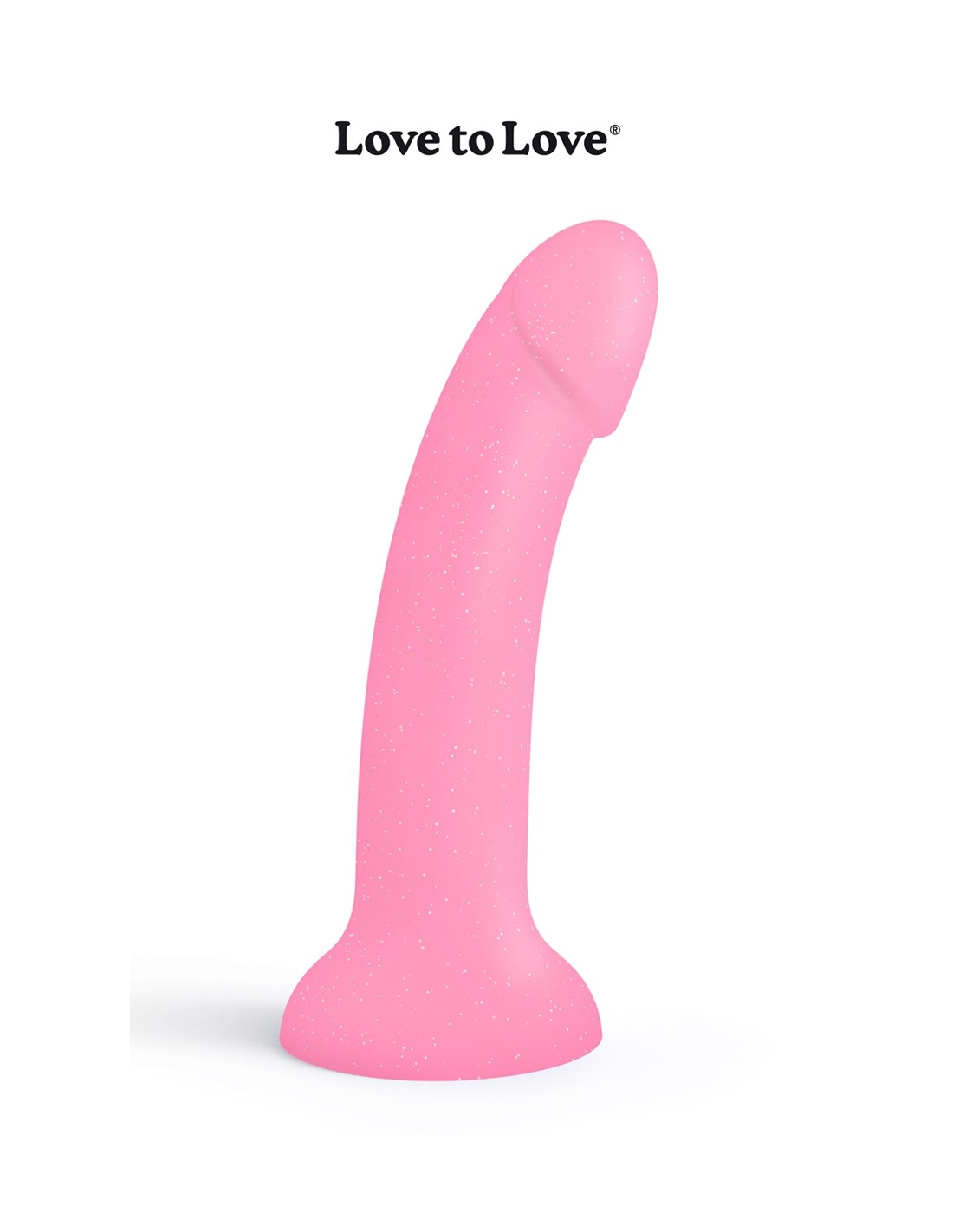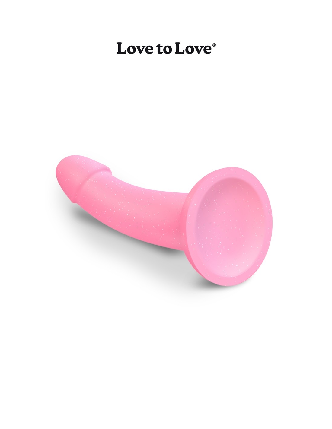Dildo haute qualité, rose à paillettes, en silicone liquide, dimensions 14 x 3,6 cm, Compatible avec les harnais O ring.