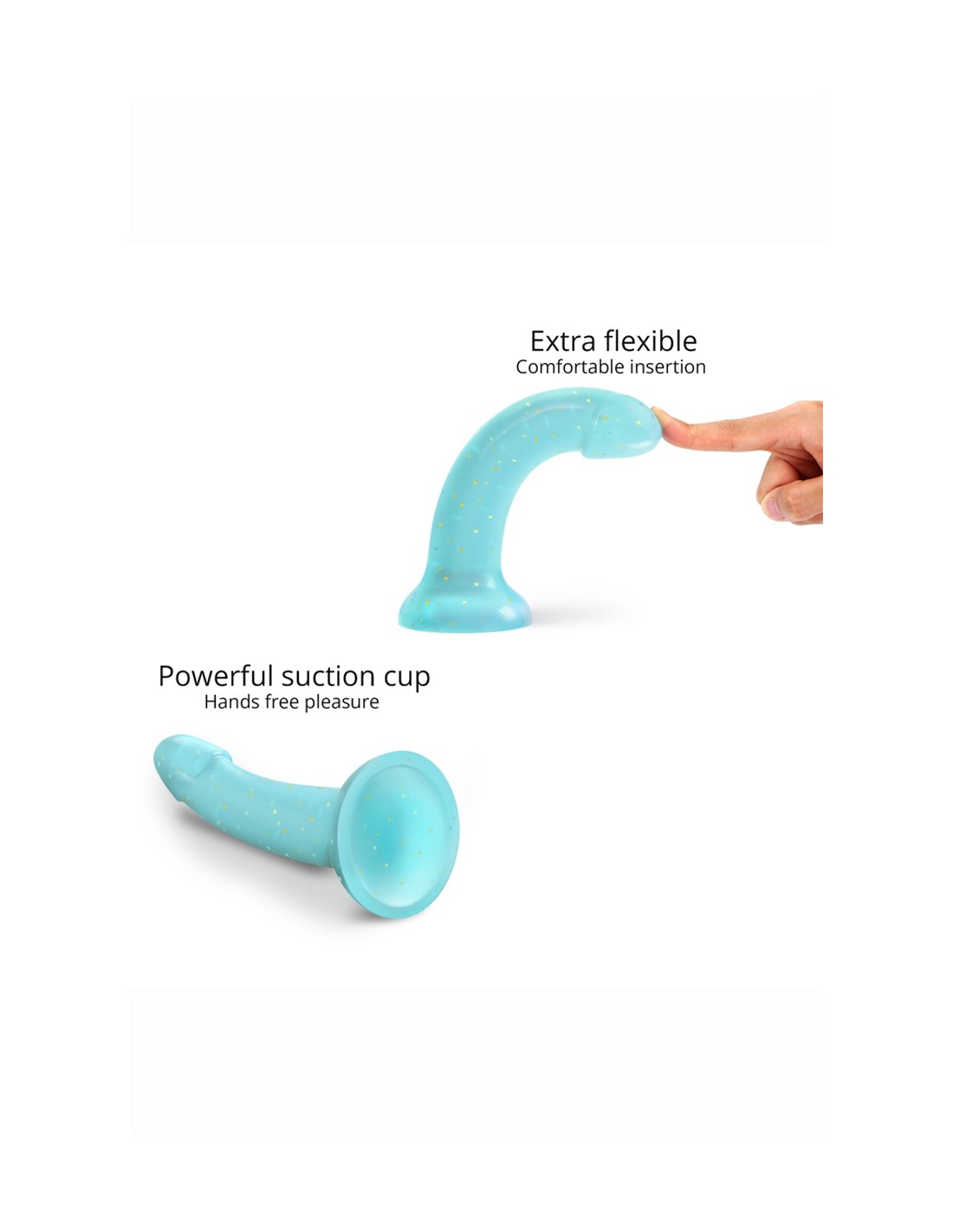 Dildo haute qualité, bleu transparent à étoiles dorées, en silicone liquide, 14 x 3,6 cm, Compatible avec les harnais O ring.