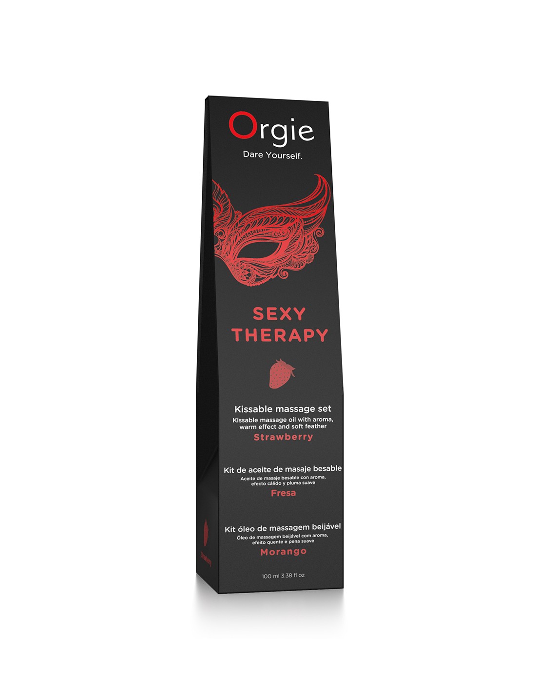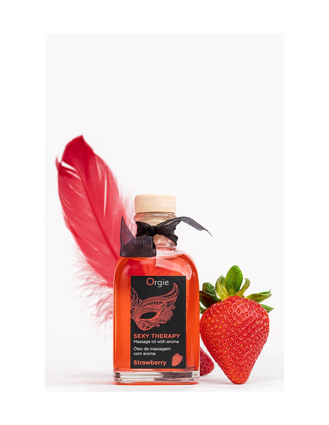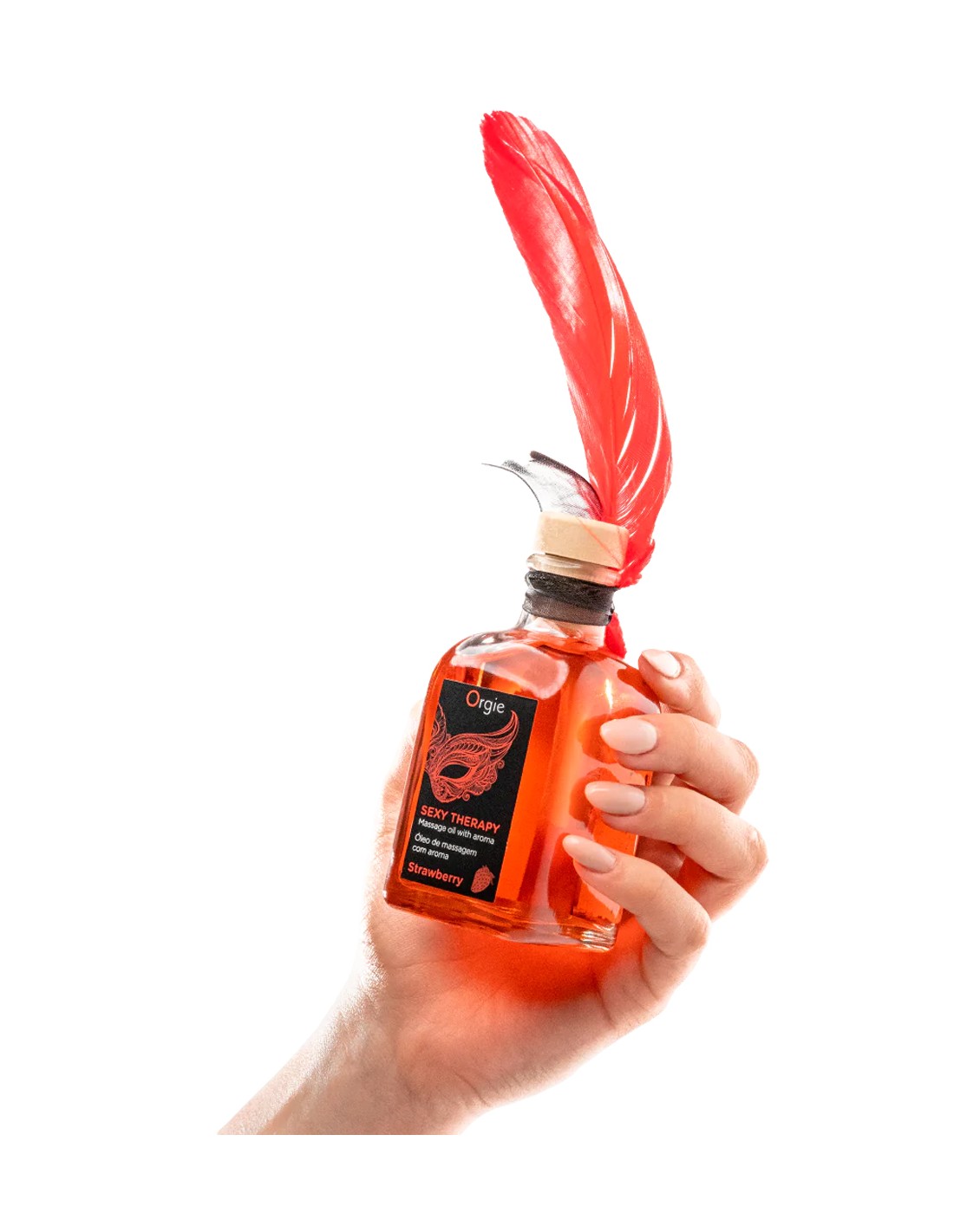Sexy Therapy Straberry, une huile de massage embrassable parfumée à la fraise, accompagnée d'une plume pour booster les sensations.