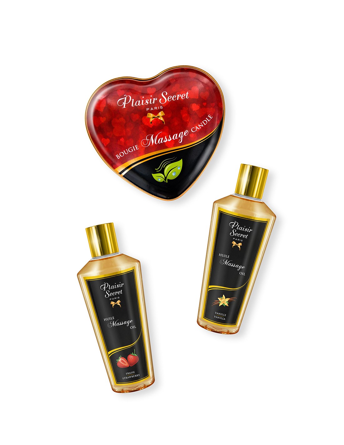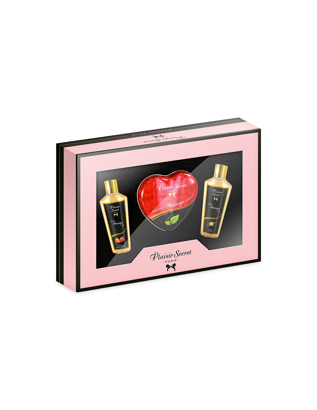 2 flacons d'huiles de massage Plaisir Secret de 30 ml et une bougie de massage gourmande de 35 ml