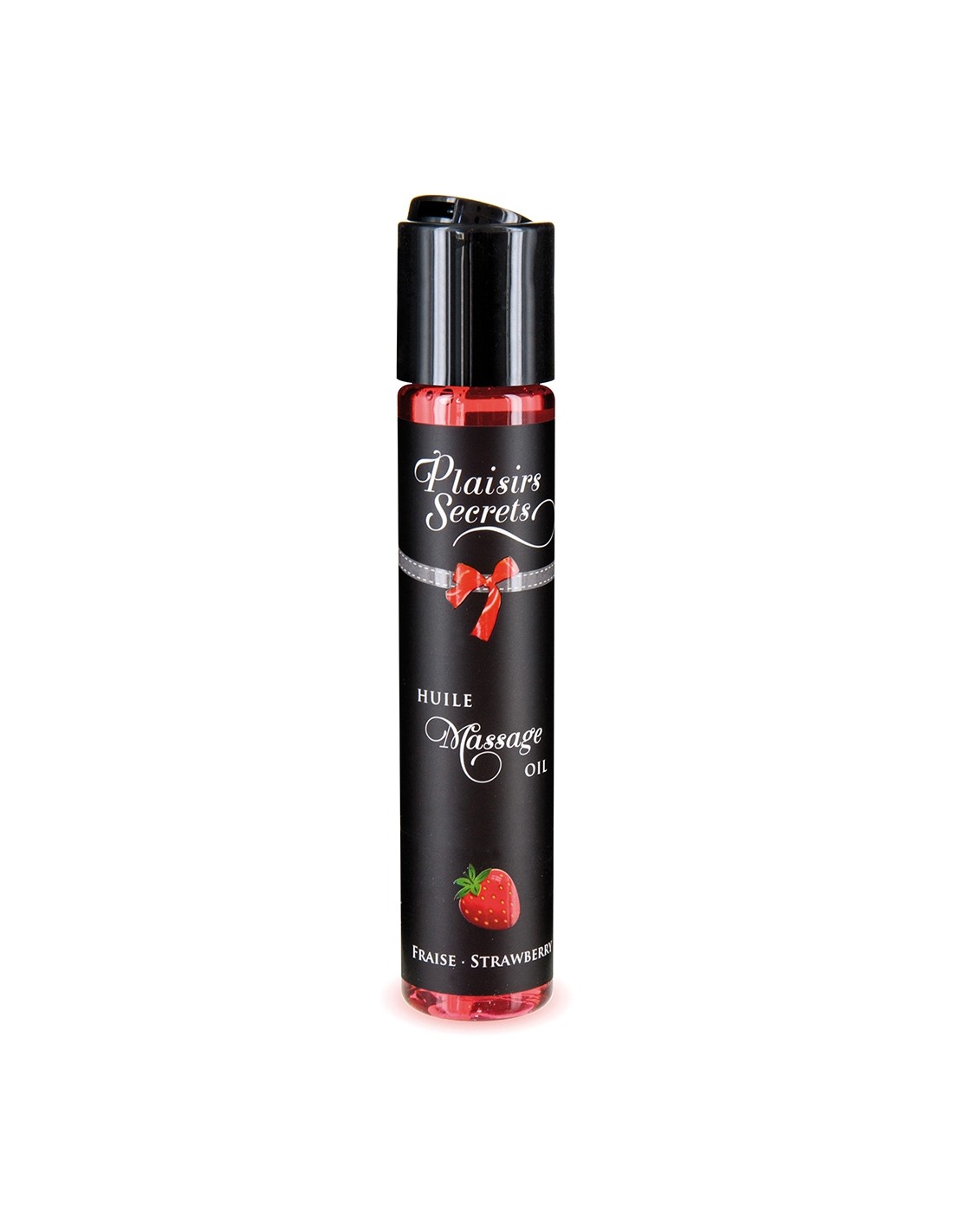 Huile de massage comestible avec goût fraise exquis, par Plaisirs Secrets.