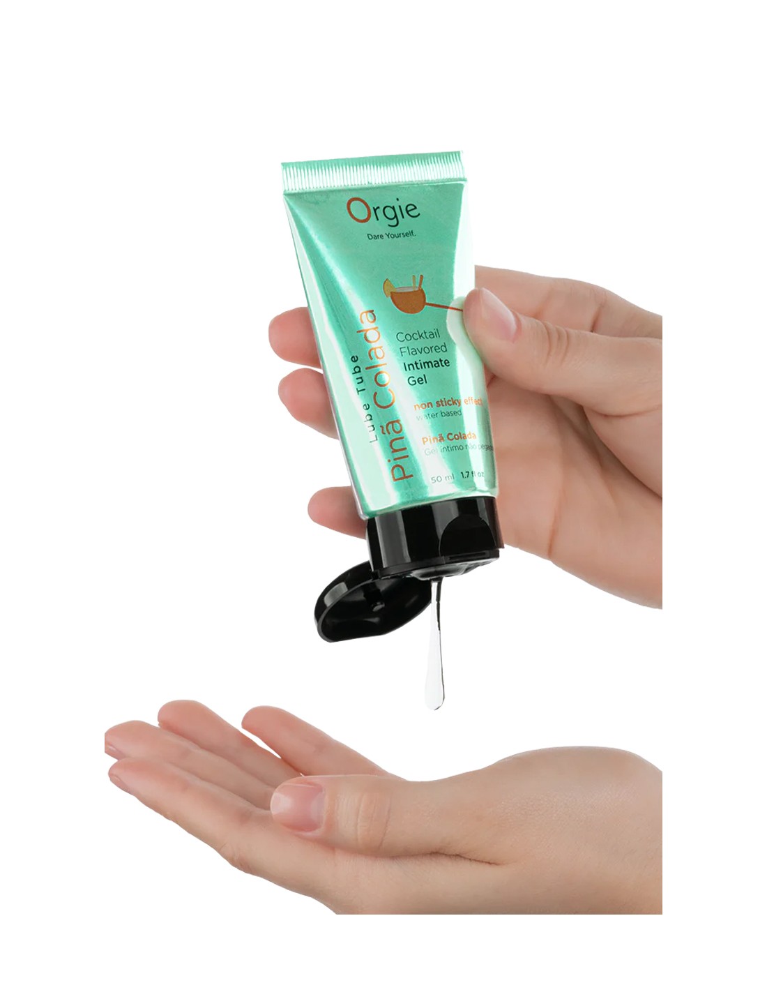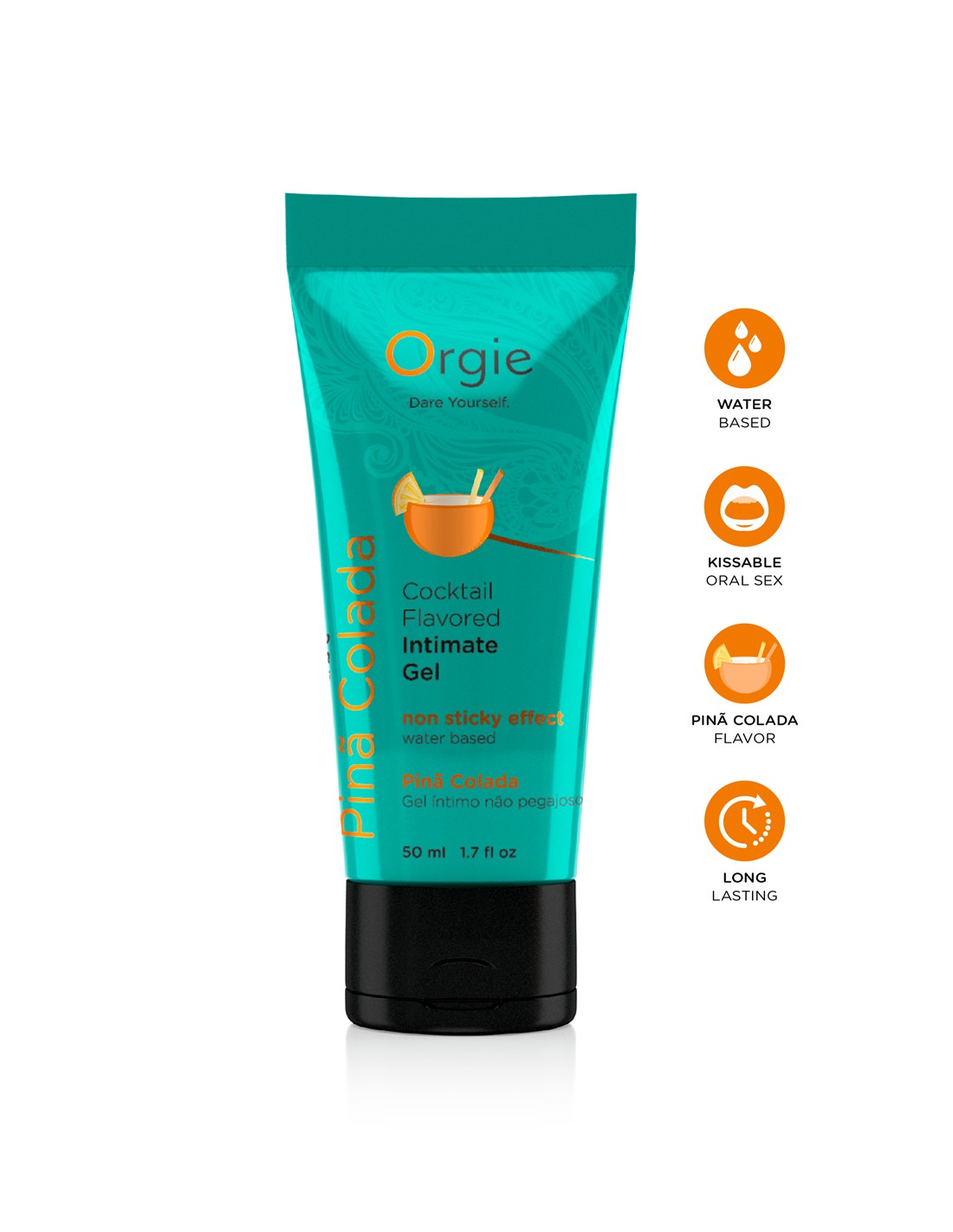 Gel intime Orgie à base deau, embrassable, longue durée, au goût de Cocktail Piña Colada, en tube de 50ml.