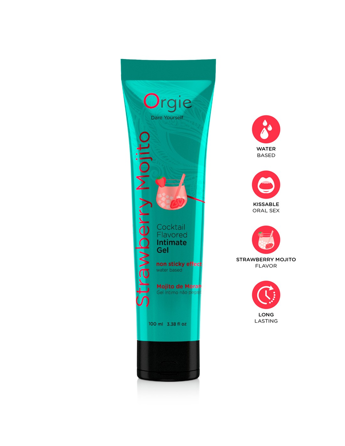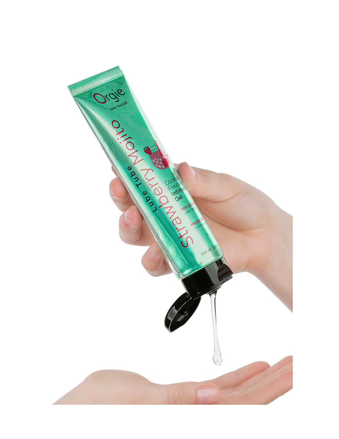 Gel intime Orgie à base deau, embrassable, longue durée, au goût De Cocktail fraise Mojito, en tube de 100ml.