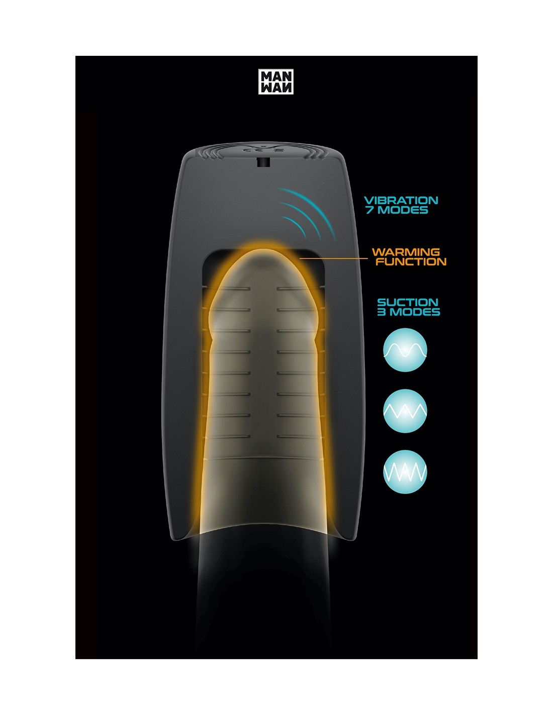 Une fois le pénis à lintérieur du sextoy, appuyez sur l'un de ses 3 boutons pour activer le chauffage de la gaine, la fonction succion (3 modes d'aspirations) et / ou la fonction vibrations (7 modes).
