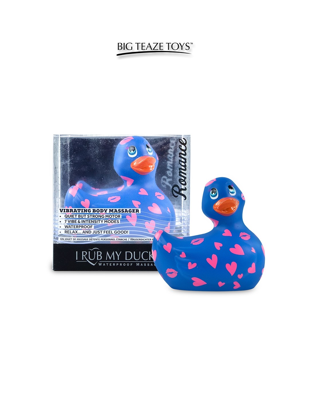 Le canard vibrant le plus célèbre du monde, "I Rub My Duckie" de la marque Big Teaze Toys, se présente dans lédition "Romance" et plus précisément en version bleu recouverte de petits curs et de bisous roses. Son design revu le rend plus actuel et plus fun.