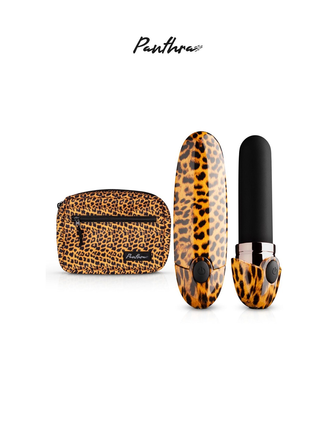 Puissant vibromasseur rechargeable couleur panthère, ressemblant à un rouge à lèvres coloris panthère et sa pochette de transport assortie.
