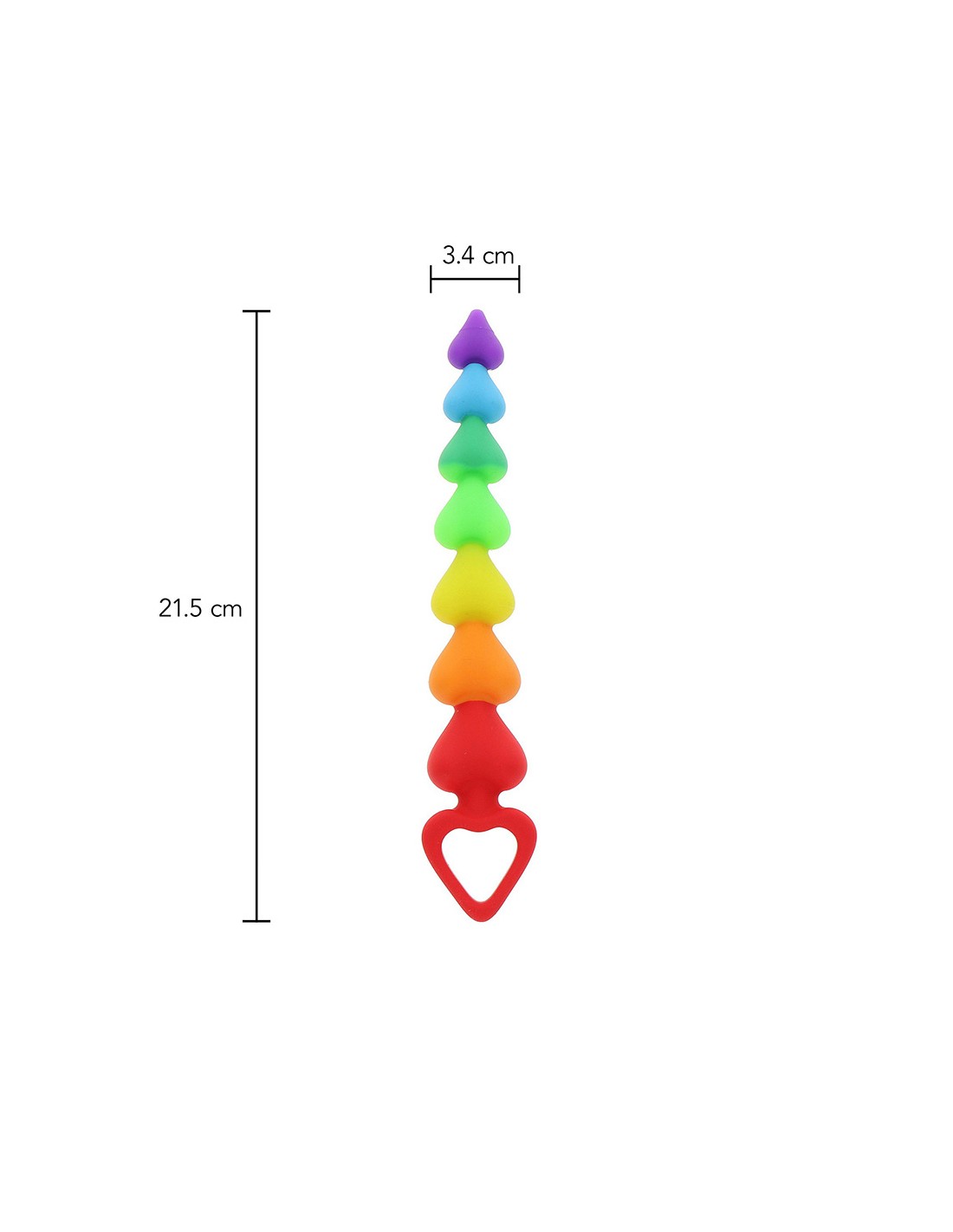 Stimulateur anal en silicone, dimensions 21,5 x 3,4 cm, composé de 7 perles en forme de cur de couleur arc-en-ciel.