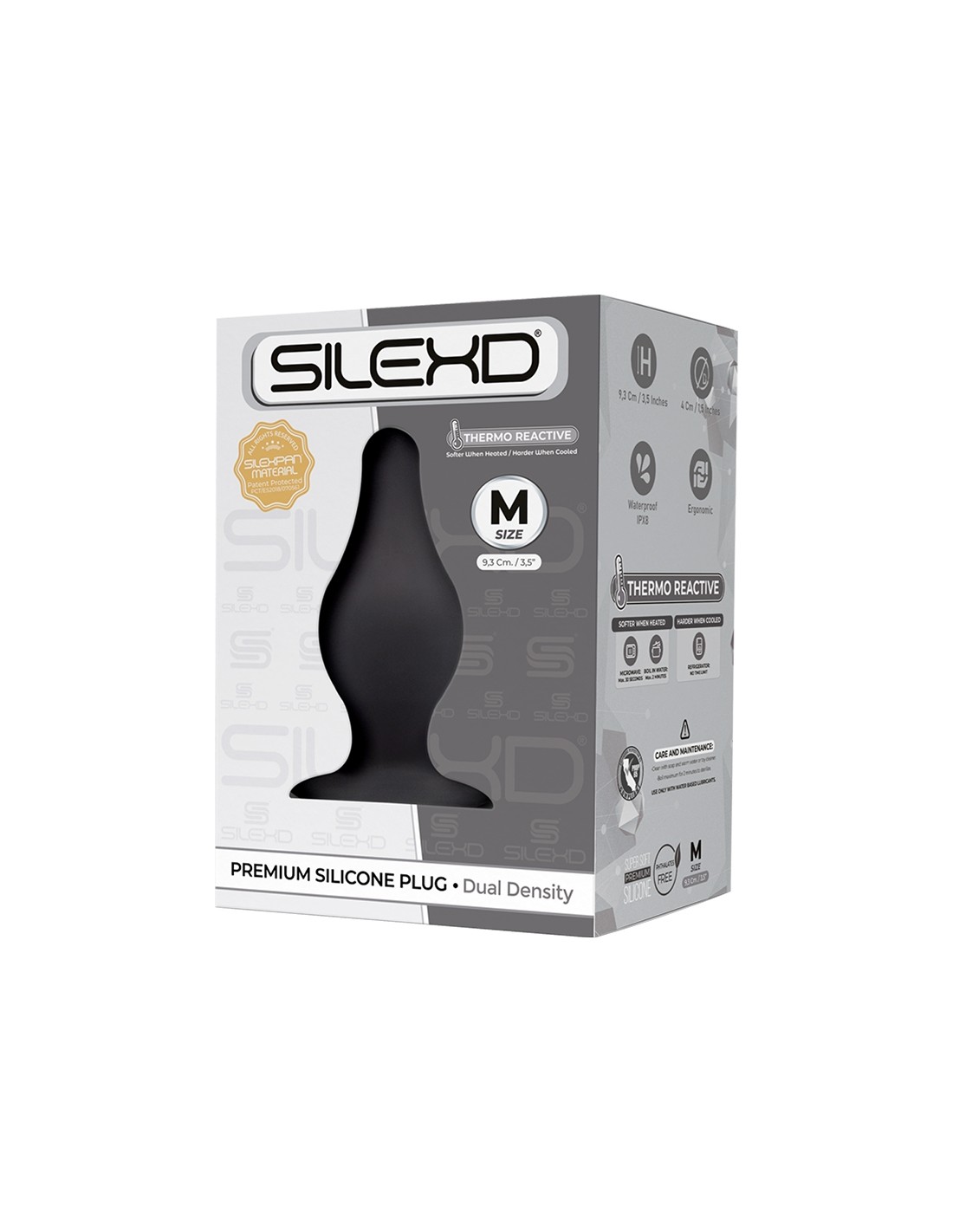 La marque SilexD propose aux amateurs de plaisir anal ce luxueux plug anal taille Medium, double densité et thermo réactif de 9,3 cm de longueur par 4 cm de diamètre, conçu en silicone Premium à mémoire de forme.