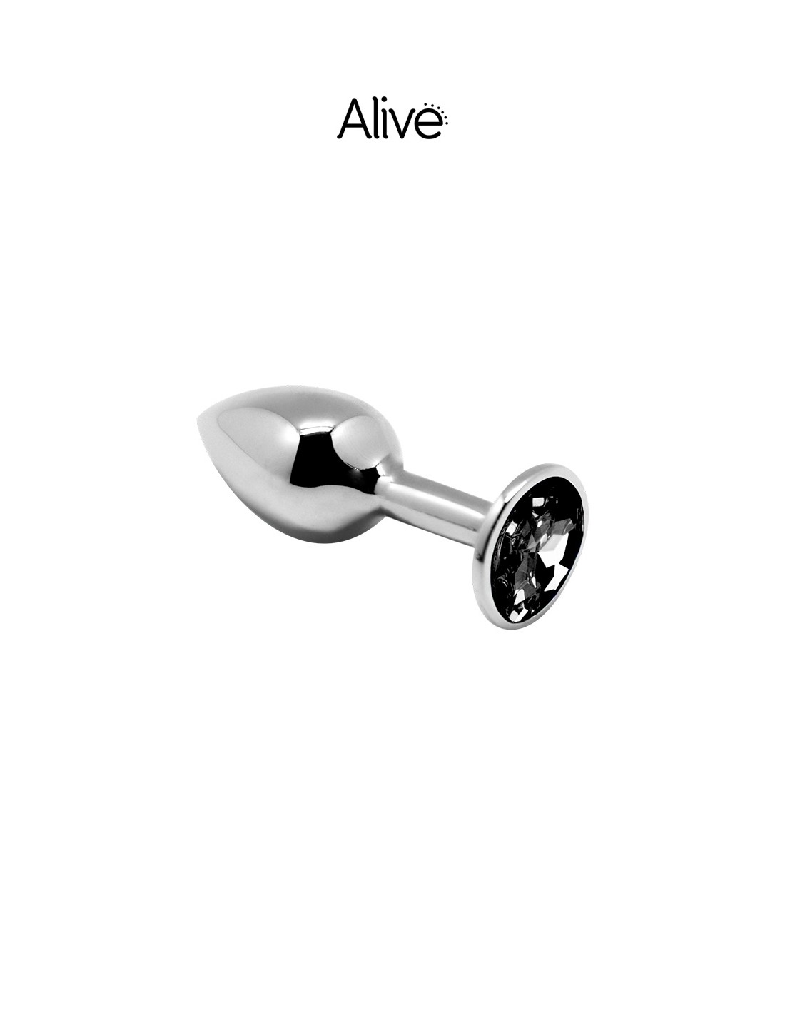 Plug anal en métal dune longueur de 7 cm et un diamètre de 3,4 cm décoré d'un strass noir.