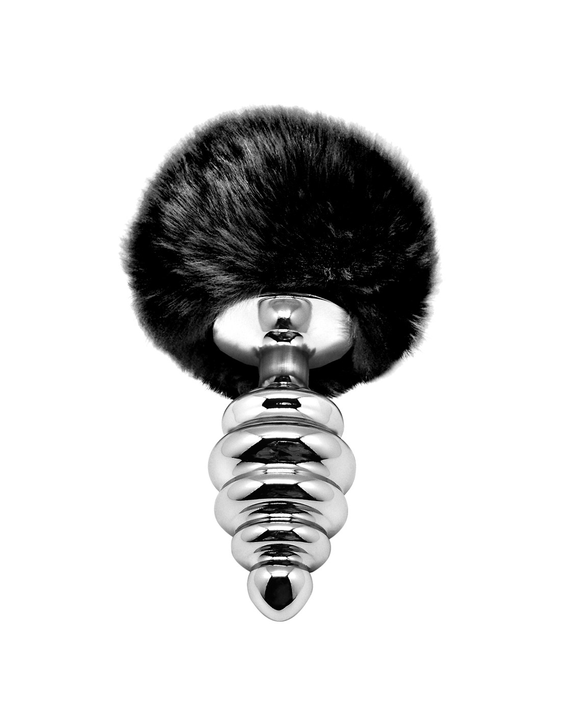 Plug anal en métal, modèle Large 9 x 4 cm, forme annelée, surmonté d'un pompon noir en fourrure synthétique.