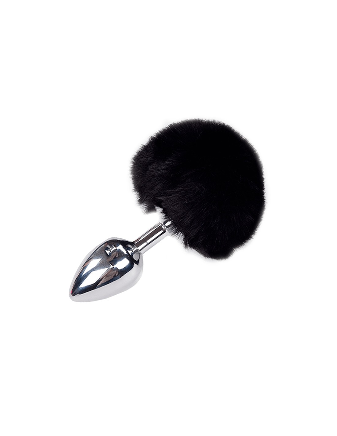 Plug anal en métal, modèle Medium 8 x 3,5 cm, forme lisse, surmonté d'un pompon noir en fourrure synthétique.