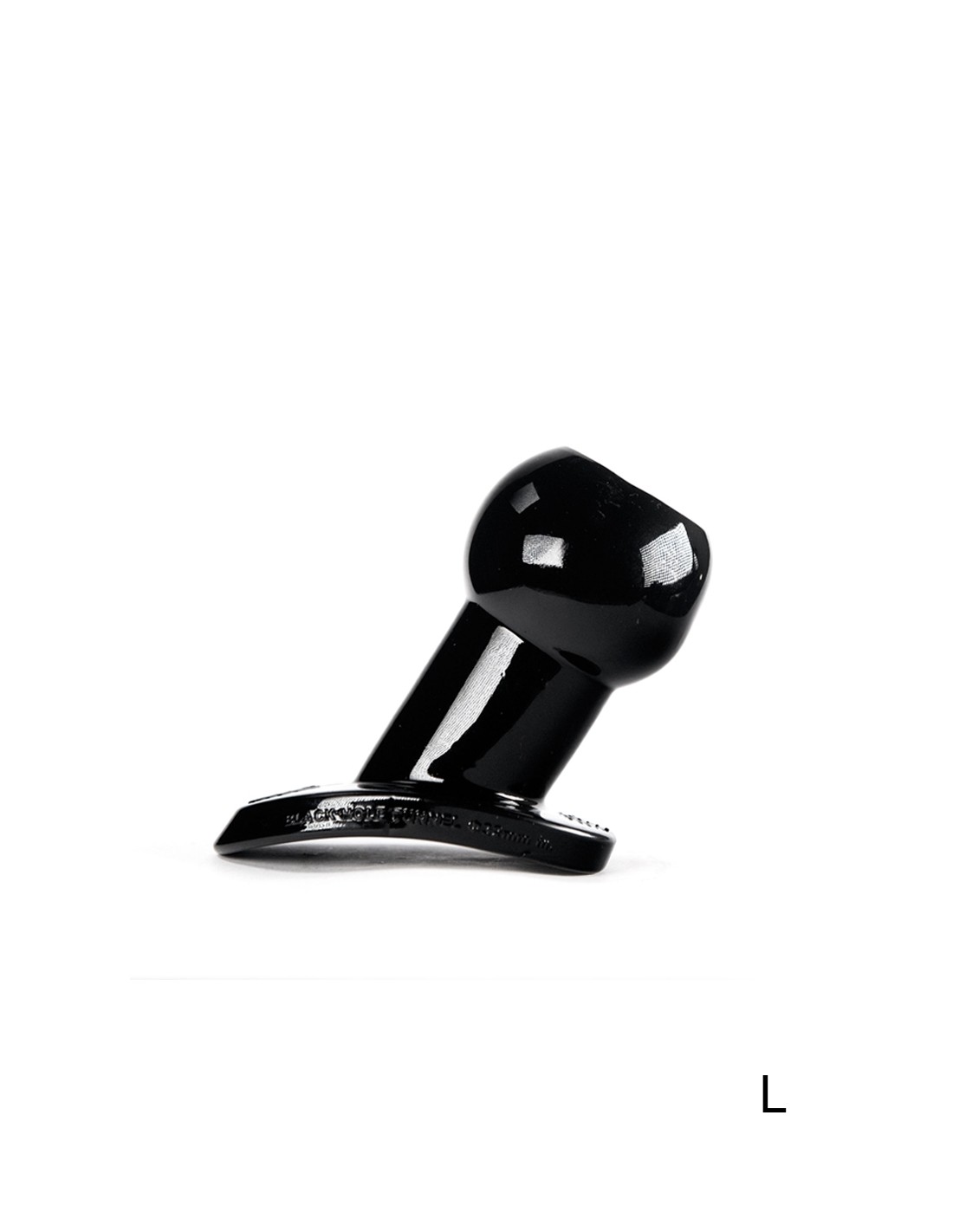 Plug anal noir en TPR, taille large, transpercé par un tunnel sur toute sa longueur.