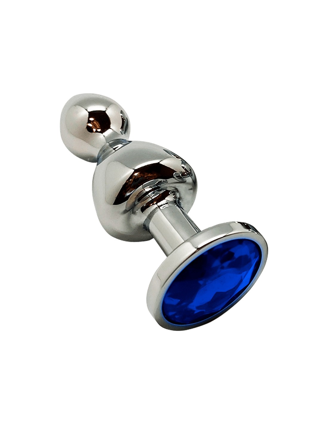 Plug anal / rosebud en métal 10,5 x 3,5 cm, avec double boule spéciale sensations et bijou strass bleu à sa base.