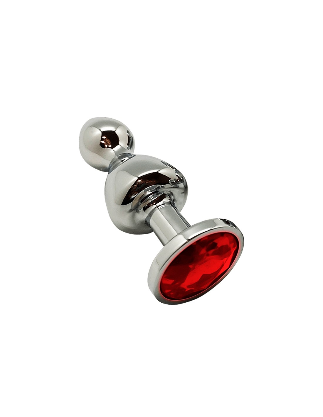 Plug anal / rosebud en métal 8,5 x 2,8 cm, avec double boule spéciale sensations et bijou strass rouge à sa base.