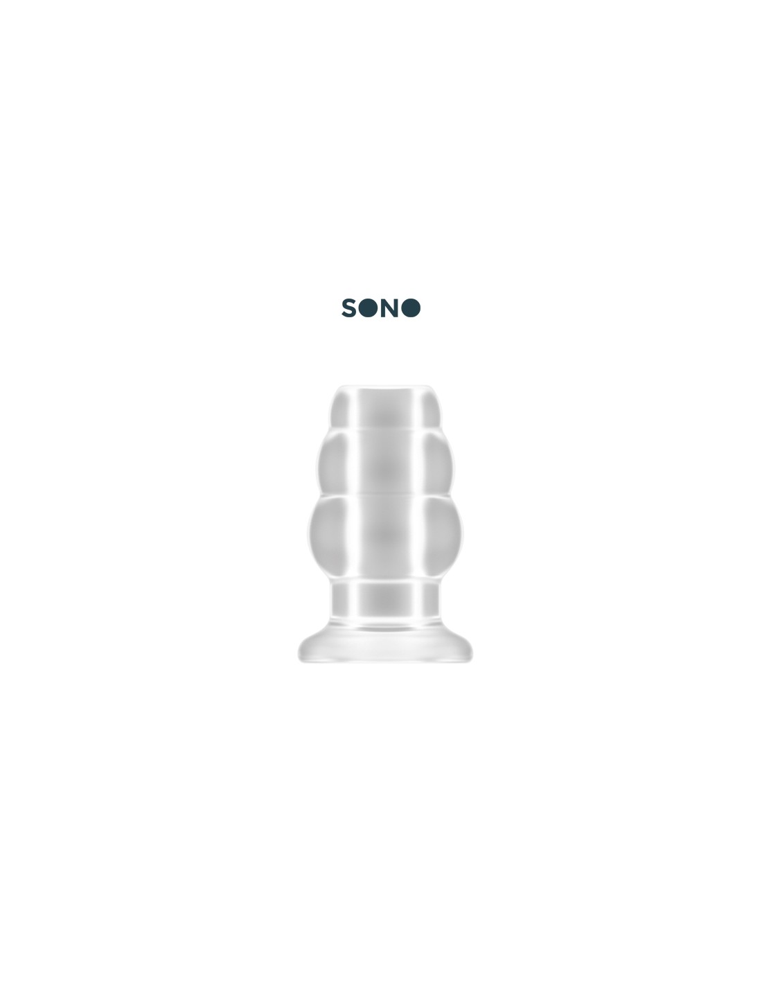 Petit plug anal translucide, creux au milieu, 7,7 cm de long par 4,3 cm de diamètre maxi.