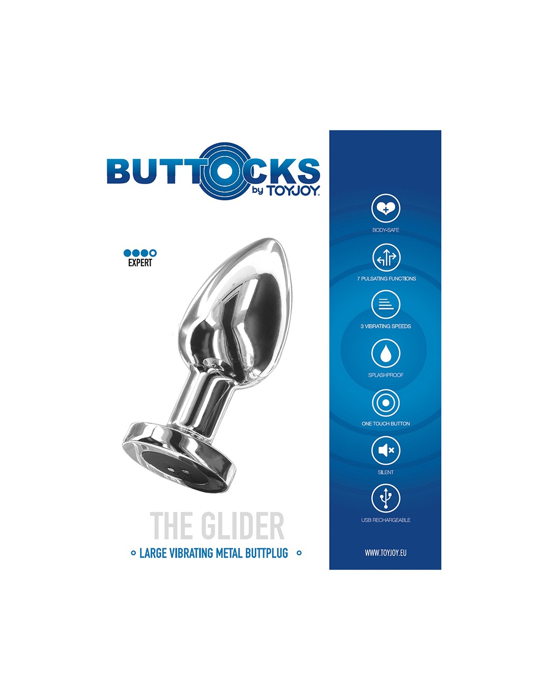Plug anal vibrant en acier inoxydable, dimensions 10,2 x 4,1 cm, rechargeable, marque Buttocks by ToyJoy.
