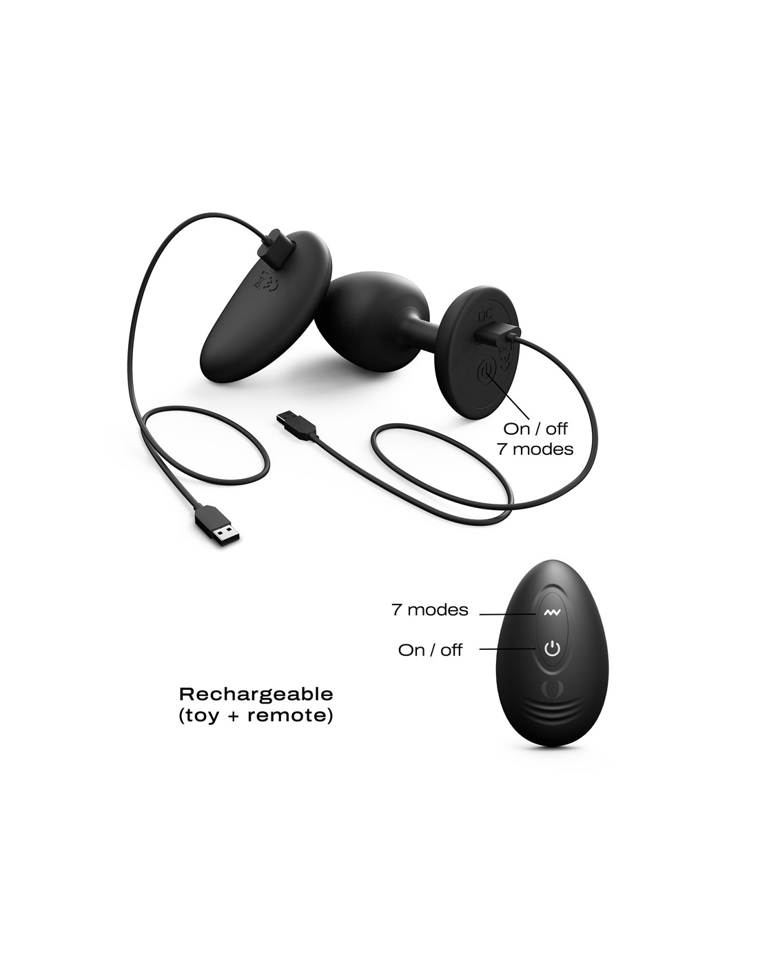 - Rechargeable par USB avec cable fourni (sextoy + télécommande)