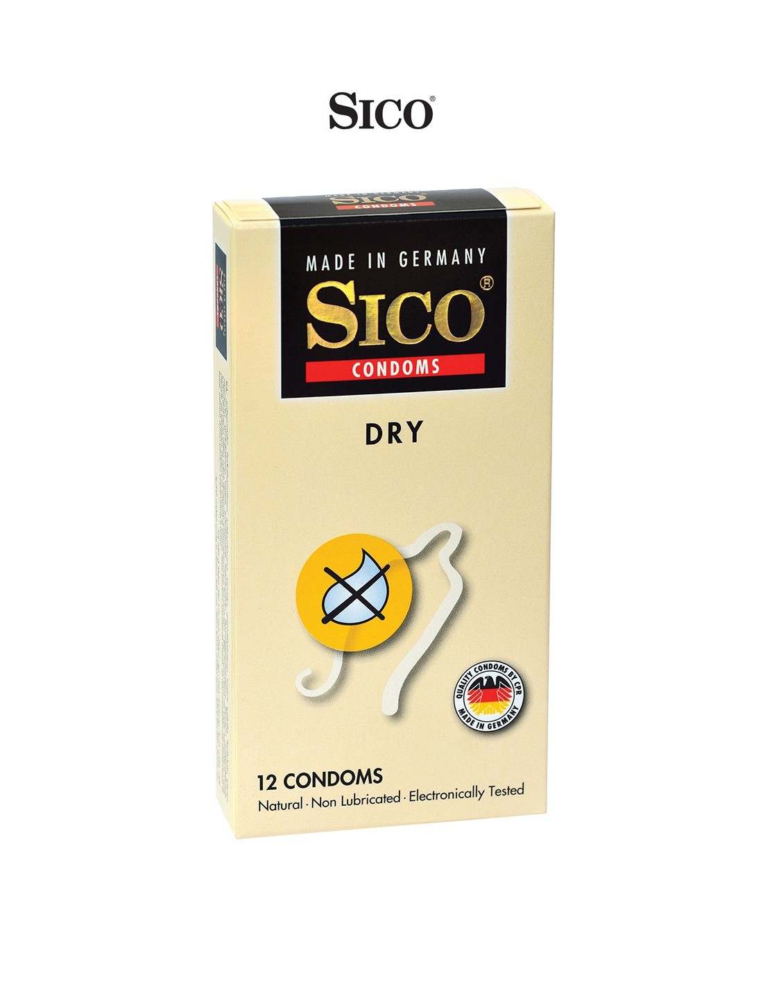 Boite de 12 préservatifs Sico DRY en latex de caoutchouc naturel, cylindriques, transparents et non lubrifiés.