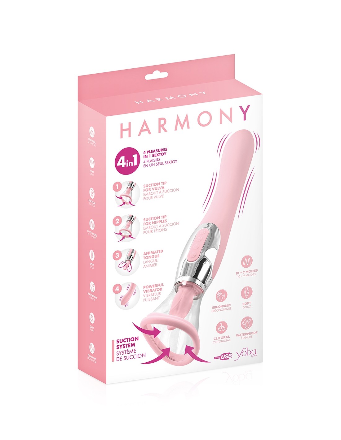 Le nouveau jouet intime Harmony rose de Yoba est le stimulateur féminin ultime qui offre de multiples possibilités de plaisirs : aspiration/succion de la vulve, aspiration/succion des tétons, cunnilingus/langue vibrante et vibromasseur/pénétration anale ou vaginale.