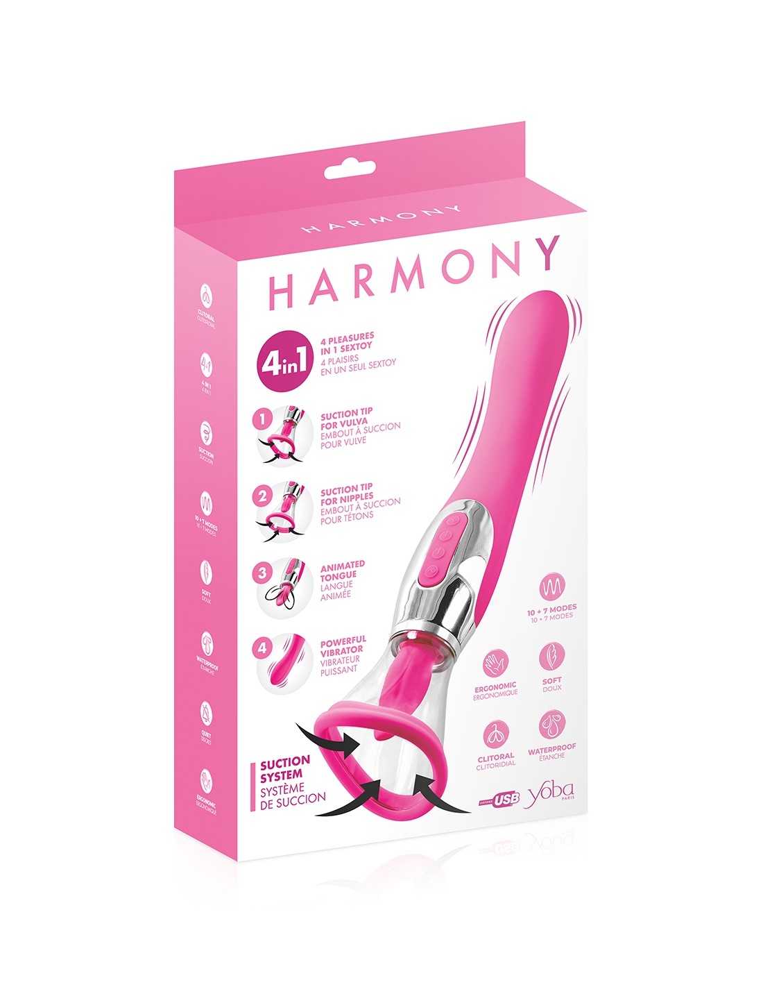 Le nouveau jouet intime Harmony fuchsia de Yoba est le stimulateur féminin ultime qui offre de multiples possibilités de plaisirs : aspiration/succion de la vulve, aspiration/succion des tétons, cunnilingus/langue vibrante et vibromasseur/pénétration anale ou vaginale.