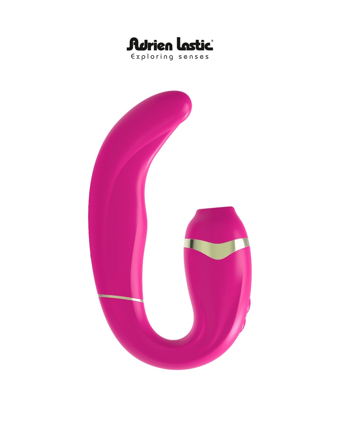 Double stimulation par succion sur le clitoris + stimulation du vagin (point G) par vibrations et tapotements (coloris rose).