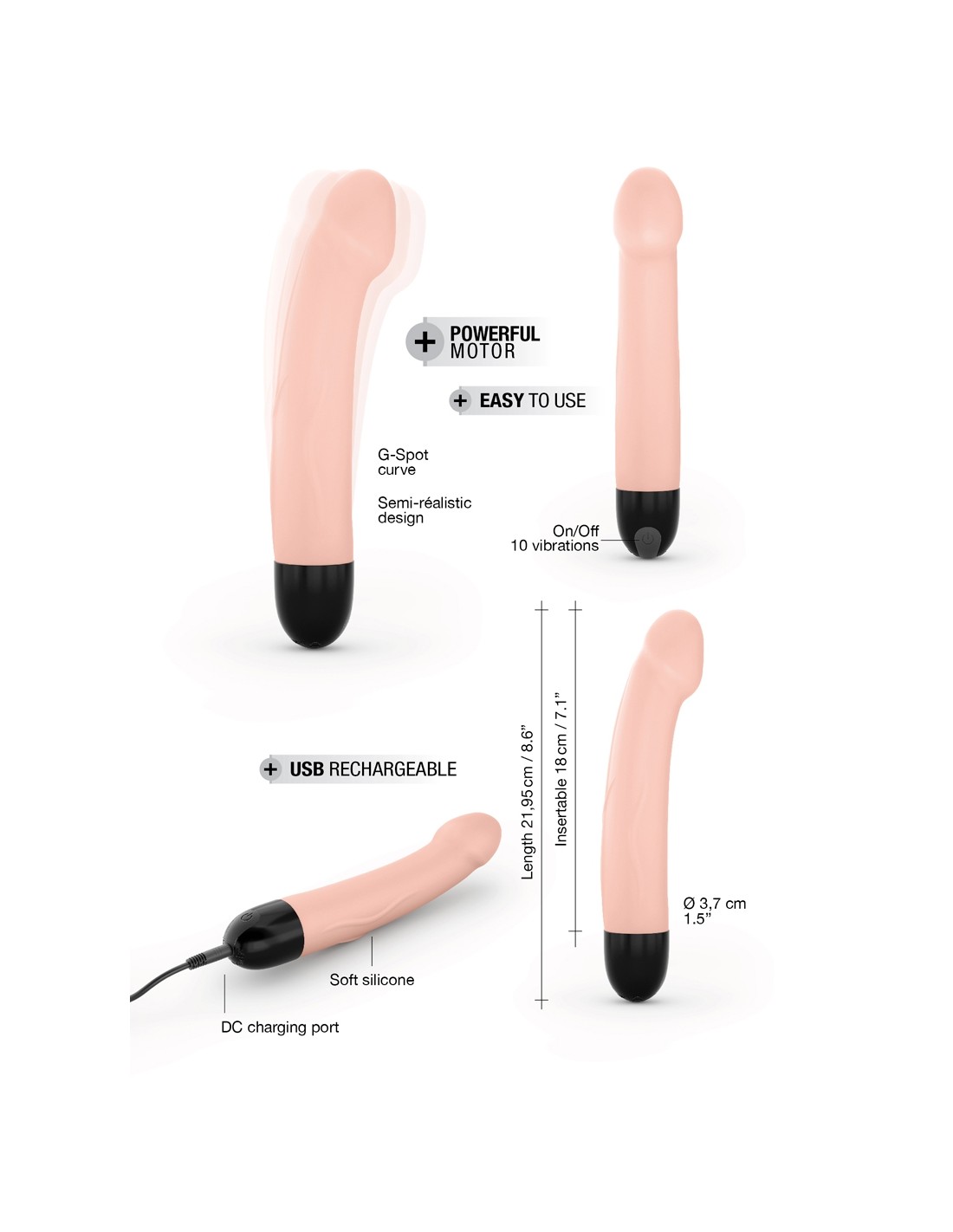 100% silicone soft touch, le sextoy est doux, soyeux, et très agréable au contact. Son moteur puissant offre 10 niveaux de vibrations. Avec sa forme courbée il est parfait pour la stimulation du point G.
