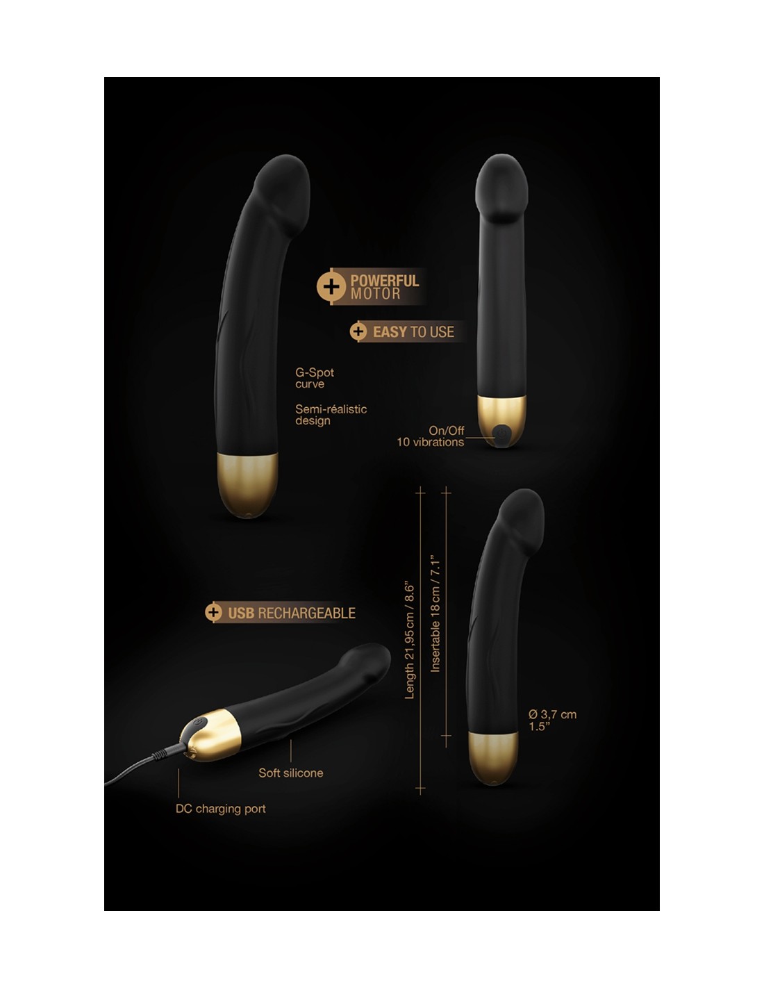 Couleur noir et or, le vibro Real Vibration M est doté d'un design semi-réaliste et d'un gabarit idéal (22 x 3,7 cm) qui comblera toutes les utilisatrices, des débutantes aux initiées.